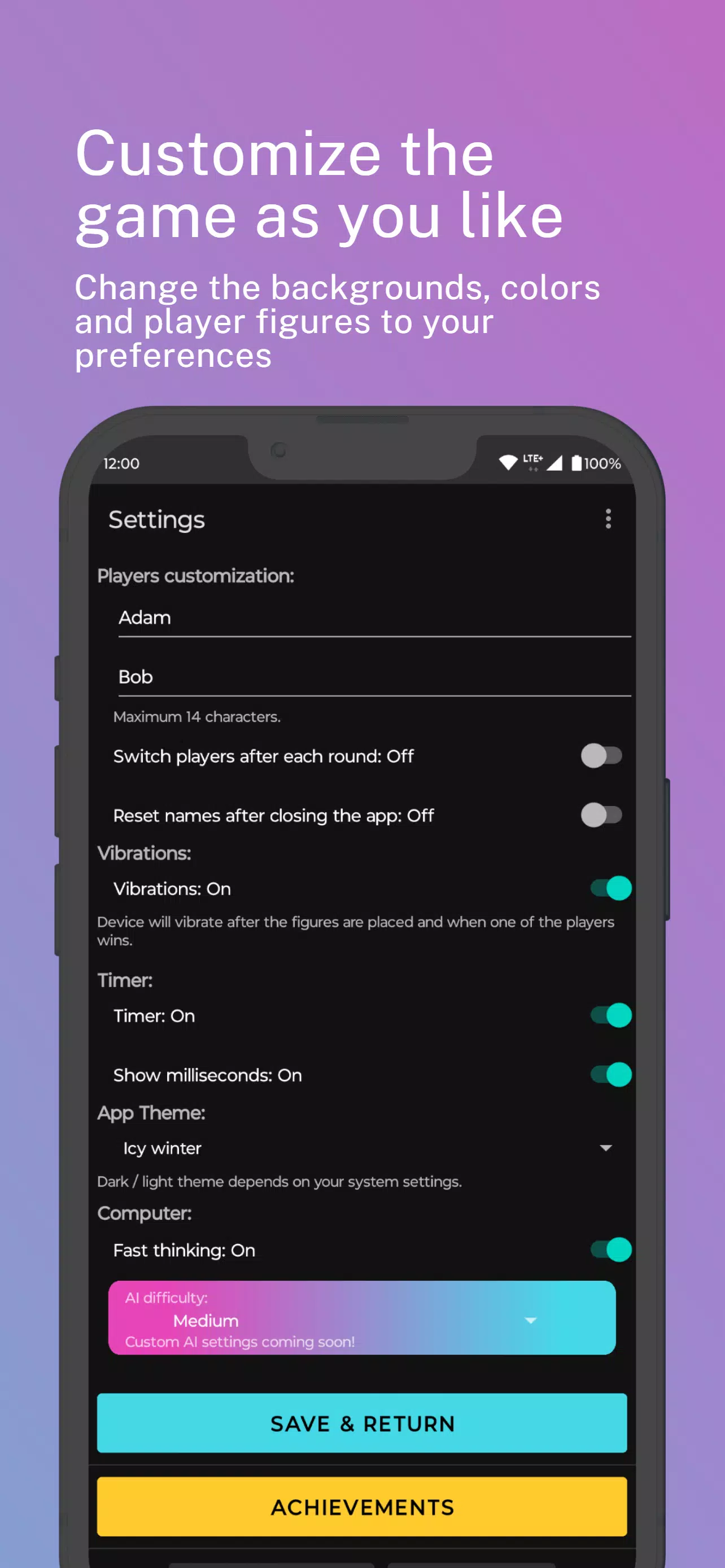 Expand your tic-tac-toe skills with new challenges that push the boundaries of your strategic thinking. Personalize your game by changing player names, backgrounds, and colors, making each match uniquely yours. Not in the mood for human competition? No problem! Test your skills against our smart AI opponent and refine your strategy to outsmart the computer.