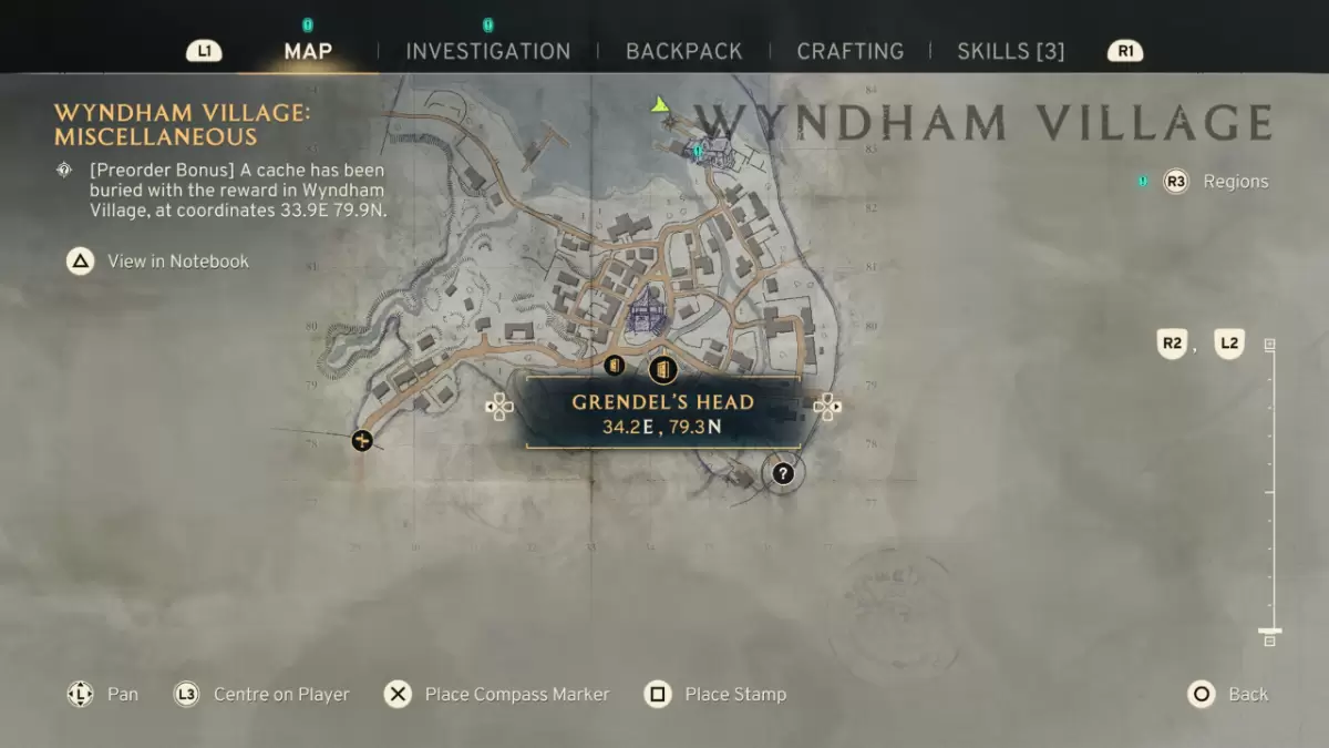 ウィンダム村に到着すると、調査対象の中に予約特典としてマークされた3つの雑多な手がかりが見つかります。最初で最も単純なのは「取引する新アイテム」というものです。この手がかりは、ウィンダム南東部のスケザーモア付近(座標 34.2 E, 79.3 N)にある「グレンデルズ・ヘッド」というパブの親切なバーテンダー、アルフへと導きます。